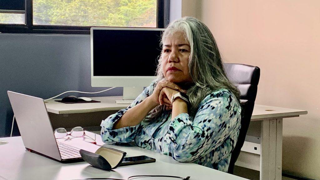 A Profa. Dra. Ana Aguilera, especialista em processamento de sinais e computação, cumpre missão técnica no laboratório para conhecer a arquitetura e os processos de desenvolvimento do VLibras.